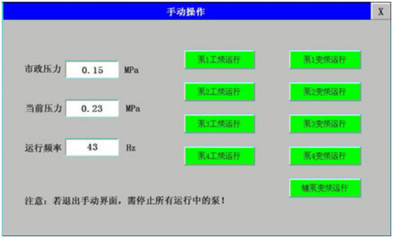 当管网压力大于启动压力时设定值时由与出水管路连接的压力罐供水,如果管网压力等于启动压力设定值时启动水泵,水泵运行中管网压力达到停止压力时停止水泵运行,水泵启动后管网压力超过启动压力,未达到停止压力时水泵继续运行;水泵全速运行后管网压力未达到启动压力时水泵追加启动。